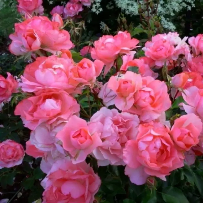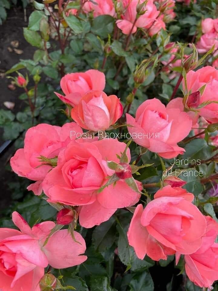 Эта красивая ветвистая флорибунда завоевала множество наград в Европе за эффектность в саду. Цветки густомахровые, с множеством коротких волнистых лепестков, прекрасно переносят дождь и ветер. Они ярко-розовые с лососевым оттенком, и более серебристо-розовыми изнанками лепестков. Однако окраска неоднородная, т.к. на цветке есть пятна более темной окраски, а кое-где белые, что создает необычный эффект. Цветки появляются в плотных кистях, обычно по 3-8 шт, иногда больше. Цветение невероятно обильное и почти непрерывное до поздней осени. Куст Jardins de France широкий, ветвистый, с очень красивой устойчивой к болезням, темной блестящей листвой. Обычно розу обрезают и выращивают кустом около 1 м высотой, без обрезки может вырасти вдвое выше.