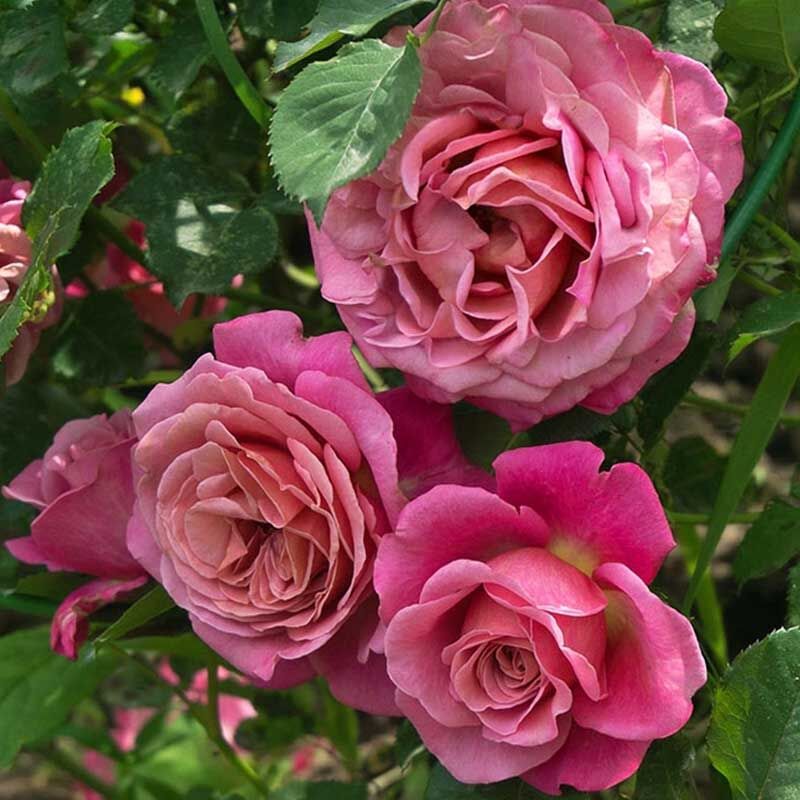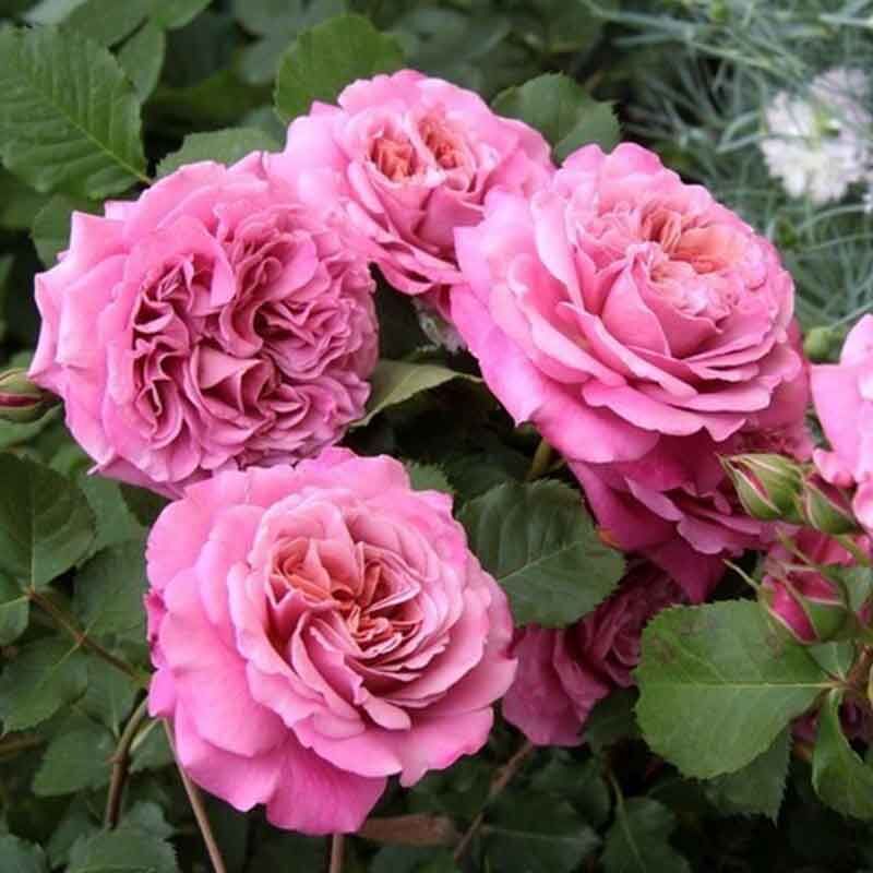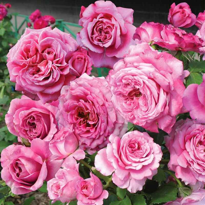 Цветки в сиреневых, лавандовых, мажентовых, пурпурных, или фиолетово-розовых тонах. Аромат насыщенный, с оттенками корицы, малины, пряностей и клубники. Цветки около 11 см в диаметре, средние или крупные, густомахровые, в кистях, квартированные, полушаровидной формы. Цветение обильное, серией волн весь сезон. Куст компактный, хорошо разветвленный. Листва средних размеров, блестящая. Высота 100-120 см, ширина 60-80 см. Очень устойчив к болезням.