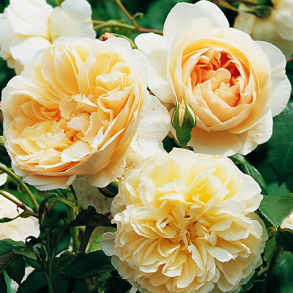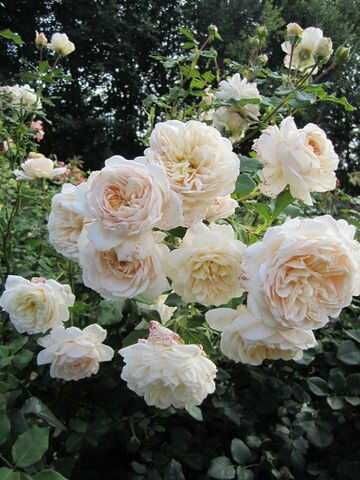 Персиково-розовые бутоны постепенно распускаются в аккуратные чашевидные розетки. Каждый цветок представляет собой идеальный круг кремово-абрикосовых плотных восковых лепестков, окружающих мелкие внутренние лепестки. Со временем внешние лепестки отгибаются вниз, образуя огромный помпон кремово-белого цвета. В массе цветок выглядит почти чисто белым. Куст сильный, округлой формы, цветки изящно поникают. Очень подходит для бордера, гармонирует с другими цветами, может служить посредником между розовыми и желтыми цветами. Аромат легкий, на определенной стадии с заметными нотами гвоздики. (AUS)Класс: шраб