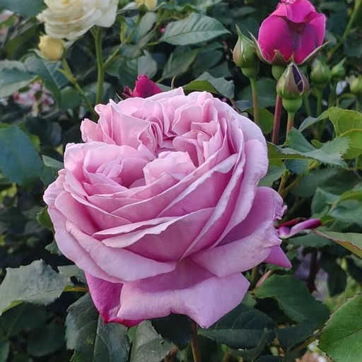 Цветок Дитер Мюллер (Dieter Muller) классического или даже старомодного вида издает необычайный сильный аромат аниса, базилика, укропа, лаванды, манго и личи. Его бутоны насыщенного сиреневого цвета, расположенные в чашечке, распускаются в роскошные розово-лиловые цветы на кустах с пурпурными стеблями, мощных и очень устойчивых к болезням.