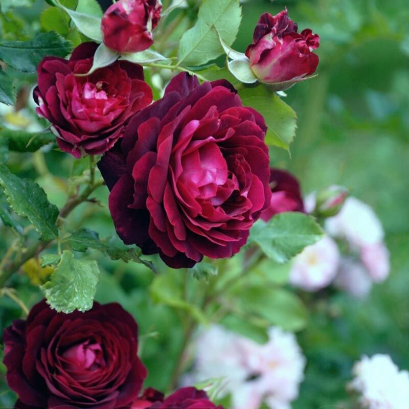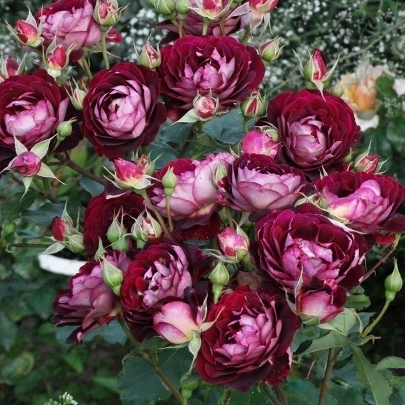 Мощный куст с крепкими побегами может достигать высоты 1,2 м. Цветы, собранные в кисти, источают сильный аромат с нотками клубники. Бархатистые лепестки насыщенного пурпурного цвета с приятным нежно-розовым реверсом. Роза цветет несколькими длительными волнами за сезон и отличается хорошей сопротивляемостью к болезням. Роза названа в честь крестницы бридера. Massad Франция, 2016