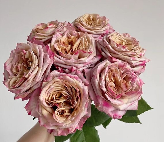 Роза Пиммс — бокаловидная роза коричневого цвета с розовым налетом на краях лепестков. Чем ярче солнце, тем больше доминирует розовый. На стебле 1-3 густомахровых цветка (50 лепестков), размером 10-11 см. Цветение повторное, аромат устойчивый.