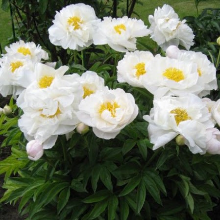 Высота: 90 Мороз (USDA): Зона 4|Зона 9 Награды: гранд-чемпион Период цветения: ранний Размер цветка: большой, 20-25 см Форма цветка: Полумахровая Селекционер: Mann van Steen 1936 Молочноцветковый пион. Ранне-среднего срока цветения. Цветок полумахровый. Распускается со светло-розовыми внешними петалодиями, потом становится чисто белым. Тычинки желтые. В сезон дождей иногда в центре цветка появляются дополнительные белые лепестки. Куст полушаровидный, крепкий с прочными стеблями. Сорт ароматный, цветение обильное и продолжительное.