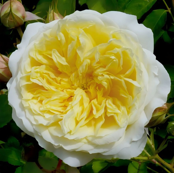 Это одна из самых надежных и красивых желтых английских роз. Часто желтые цвета у роз бывают излишне резкими, и вследствие этого их сложно разместить в саду или в доме. С The Pilgrim такой проблемы не возникнет. Его нежные шелковистые цветки очень мягкого желтого цвета, идеальной формы розетки, с многочисленными мелкими лепестками, которые усиливают общую изысканность цветка. Внутренние лепестки чисто желтые, внешние практически белые. Несмотря на свои утонченные цветки, это очень выносливая роза, сильнорослая и обильно цветущая. Куст прямостоячий, листья блестящие.