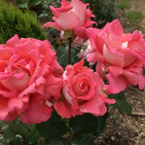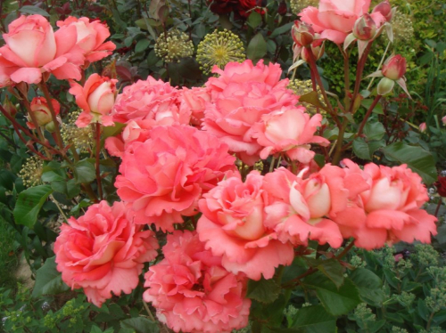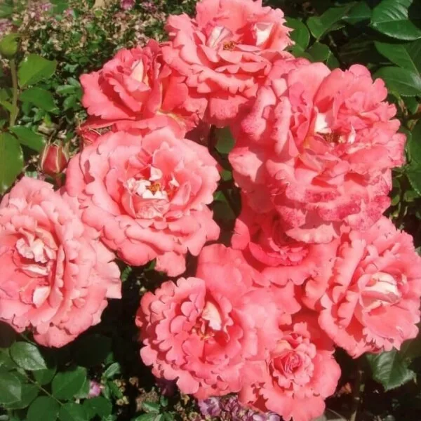 Высокодекоративная флорибунда с привлекательными цветками необычного цвета на сильных прямостоячих побегах. Цветки с легким ароматом, кораллово-розовые со светло-кремовой оборотной стороной резных зубчиками лепестков. Лепестки цветков плотные, переливаются как атлас. Диаметр цветков 8 см, устойчивы к ветру и дождю, появляются в соцветиях. Цветение длительное, повторное и обильное. Листва темно-зеленая, глянцевая. Молодые листья свекольного цвета. Высота взрослого растения 60-90 см., ширина 50 см. Сорт с хорошей зимостойкостью и устойчивостью к заболеваниям. Высота (см): 60-90 Ширина (см): 50 Диаметр цветка (см): 7-8 Цвет: розово-оранжевый Аромат: легкий Селекция: Samuel Darragh McGredy IV Новая Зеландия, 1986 Устойчивость к болезням: 3