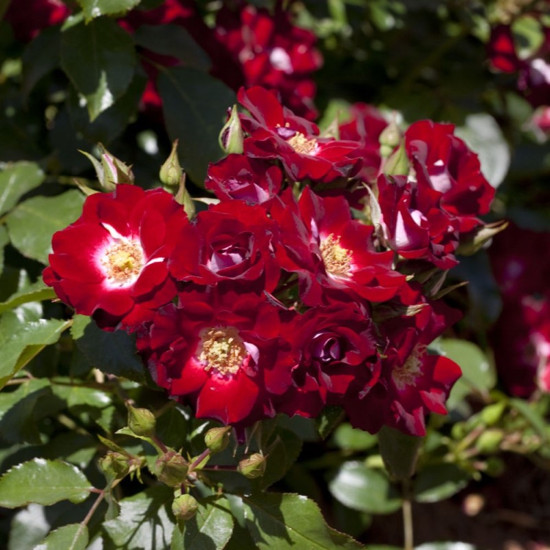 Флорибунда необыкновенно яркого темно-красного цвета с белой сердцевиной, подчеркивающей контрастность цветов. Обильное повторное цветение, яркие гроздья цветов на фоне нарядной глянцевой тёмно-зелёной листвы, качества, делающие этот сорт украшением сада. | Цвет: | темно-красный со светлым центром Кол-во цветков на стебле: | 3-5 Аромат: ? Размер цветка: | 7 см Высота: | 50-100 см Ширина: | 30-70 см USDA: | Шестая зона Meilland Франция, 2010
