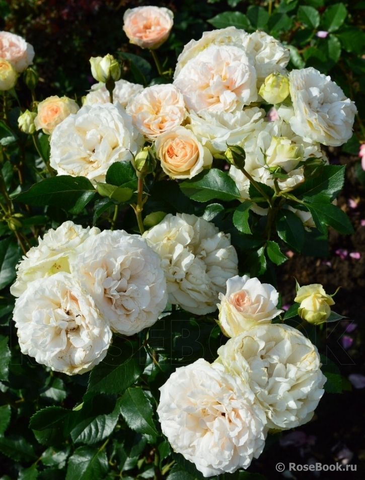 Флорибунда Sans Souci кремово-персикового цвета, в серединке может просматриваться нежный абрикосовый тон. Цветы махровые, расположены в небольших кистях или одиночно, куст компактный, высотой до 90см, листва полу-глянцевая, средне-зелёная.