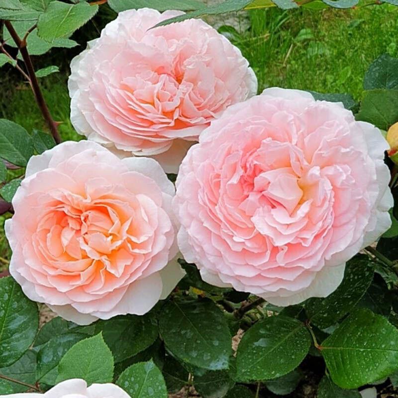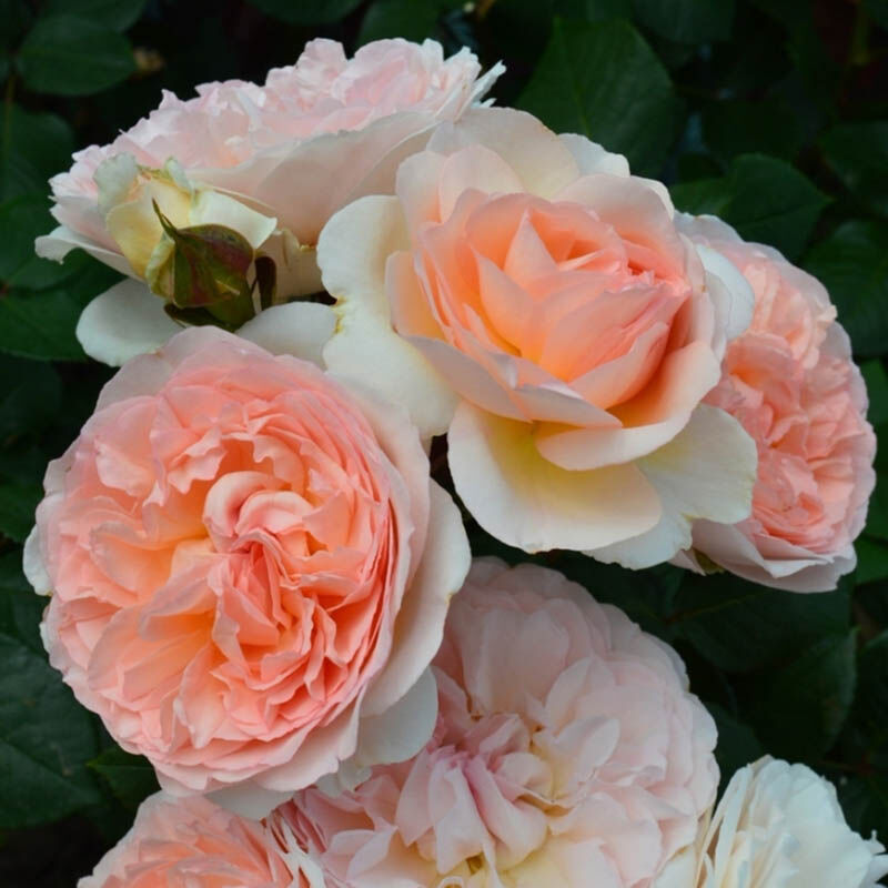 Цветы показывают очаровательную игру цветов между розовым, пастельным и абрикосовым, лепестки в кремово-розово-абрикосовых тонах, с золотисто-абрикосовым центром и светло-розовыми внешними лепестками.