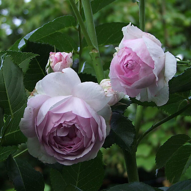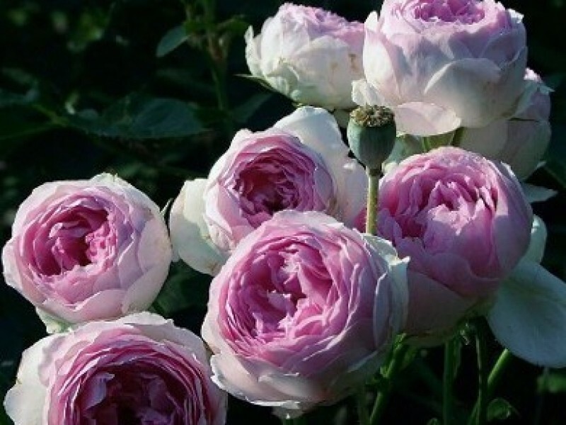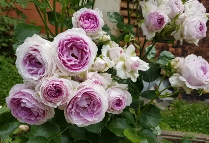 Бутон кремово-розовый, шаровидный. Цветки нежно-розово-кремовые с лиловым оттенком, густомахровые, 90 - 100 лепестков в одном цветке, обладают очень насыщенным ароматом.