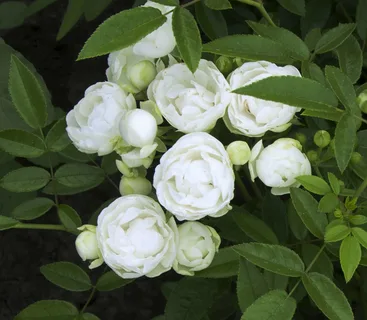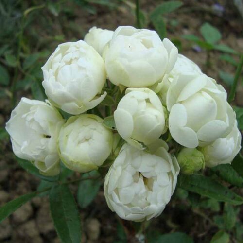 Полиантовая молочно-белая роза с оригинальной формой цветка: практически правильной шаровидной, похожей на нераспустившиеся бутоны пиона. Цветки мелкие, полу-махровые, собраны в крупные соцветия на невысоком, разрастающемся в ширь кусте с мелкой, темно-зеленой, глянцевой листвой. Цветение обильное, повторное, аромат слабый. Сорт хорош для переднего плана бордюра и контейнерной культуры, так же может выращиваться в качестве почвопокровного растения.