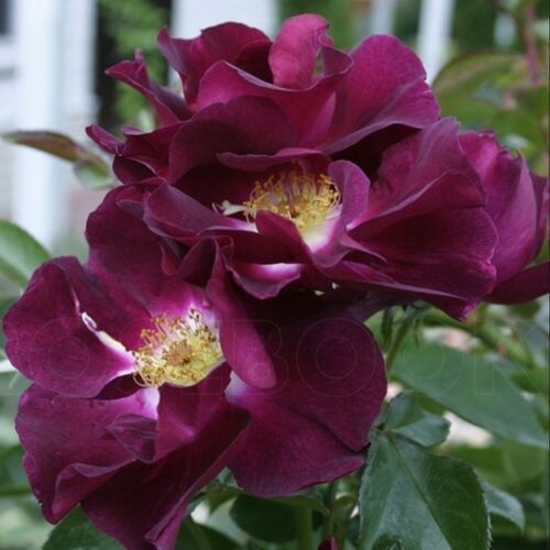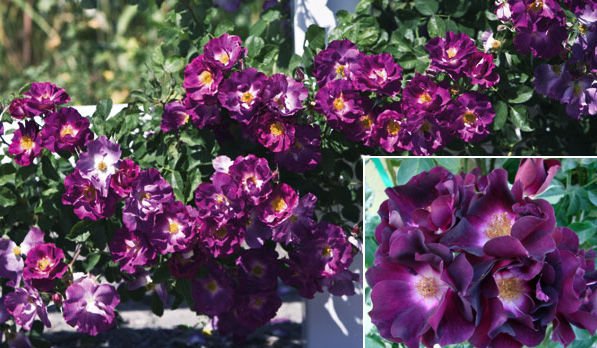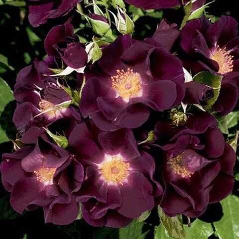 Фиолетовые, близкие по цвету к темно-красному вину, с желтыми тычинками и светлым пятном в центре, полу-махровые с волнистыми лепестками, крупные цветки с умеренным ароматом гвоздики, специй, расцветают в кистях по 3-5 штук. Побеги практически без шипов, с полу-глянцевой, серо-зеленой листвой. Аромат умеренный, сладкий, гвоздичный. Цветение повторное, уже в первом сезоне. Куст очень энергично растущий, даёт длинные побеги, покрытые чистыми серо-зелёными листьями.