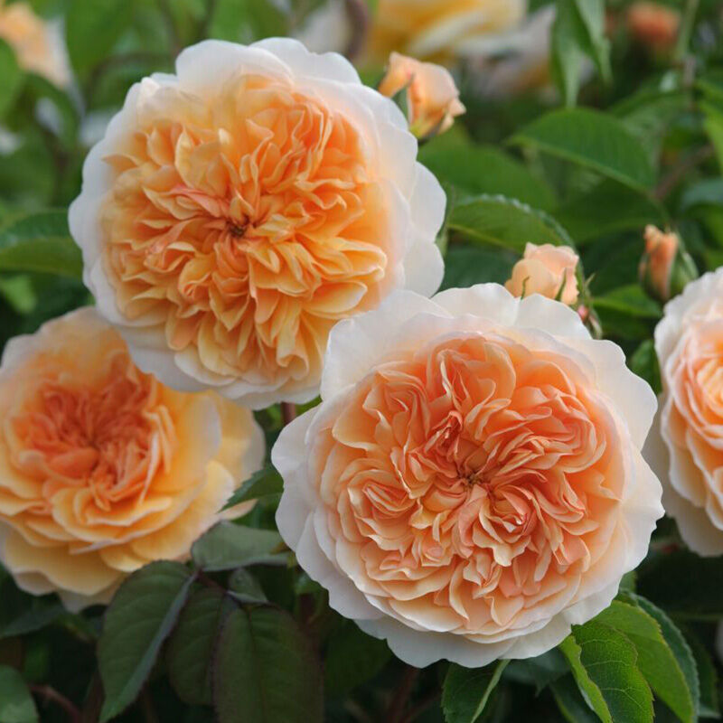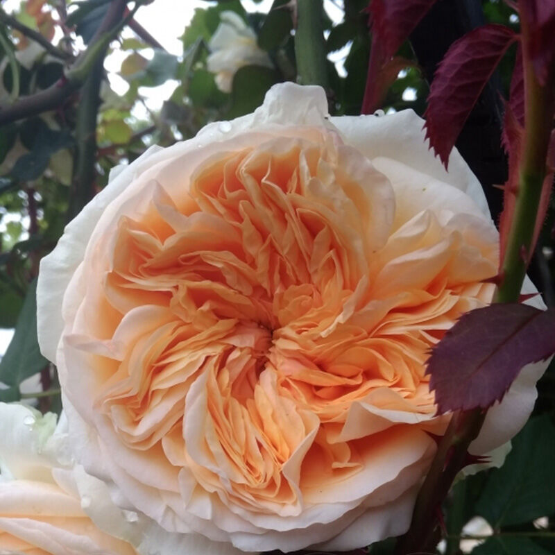 Плетистая роза с крупными (12-14 см) цветками старинной розеткоообразной формы со сложной окраской - в ней присутствуют и абрикосовый, и светло-карамельный цвет, причём, несмотря на кажущуюся тонкость лепестков, цветки не боятся дождя. Цветение обильное, повторное. Аромат фруктовый. Побеги прочные и мощные, с листвой, устойчивой к болезням.