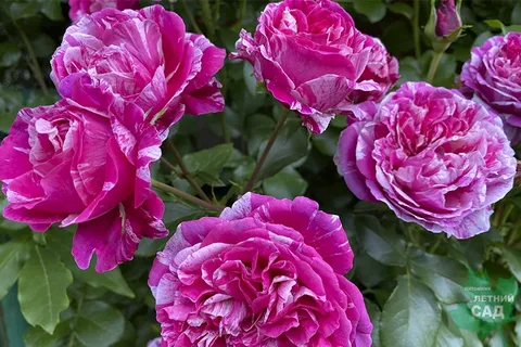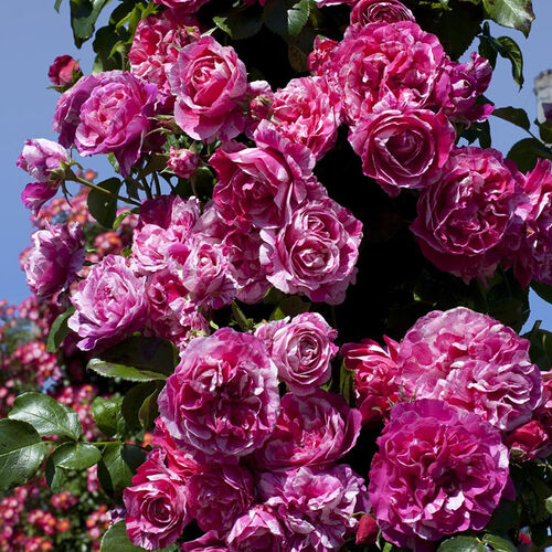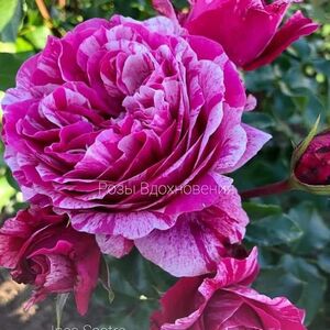 Плетистая роза с соцветиями от 6 до 15 цветков, очень крупных, сильно махровых (до 100 лепестков), оригинального цвета - насыщенно-розовый с бело-кремовыми штрихами. Аромат интенсивный, запах яблока и скошенной травы. Куст высотой около 200 см с темно-зелеными, глянцевыми листьями среднего размера. Отличная устойчивость к болезням. Морозоустойчива. Meilland Франция, 2010